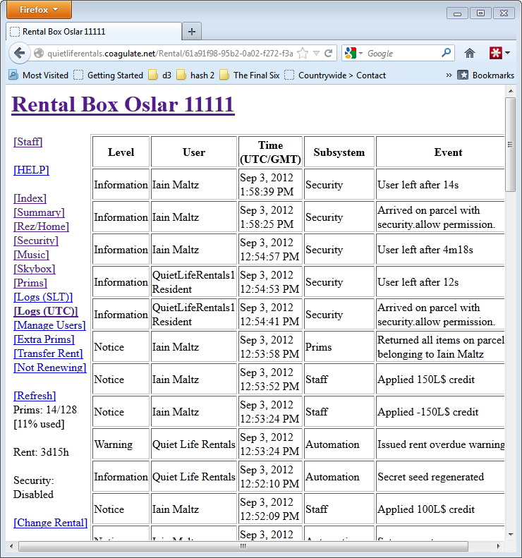 The logs page is an extensively comprehensive list of actions taken on your rental, changes made by staff, you, other users you have allowed to control your rental, security visitor detections, what happened to said visitor, and so forth are all listed on this page. The page comes in two formats, the “Logs (SLT)” version shows the time and date of events in Second Life Time (A.K.A. PST/PDT), and the “Logs (UTC)” version shows events in Universal Co-ordinated Time, (A.K.A. GMT, Zulu time, GMT+0, and so forth). Note that UTC format is not the same as UK time which may be an hour ahead of this during the summer (BST = GMT+1).